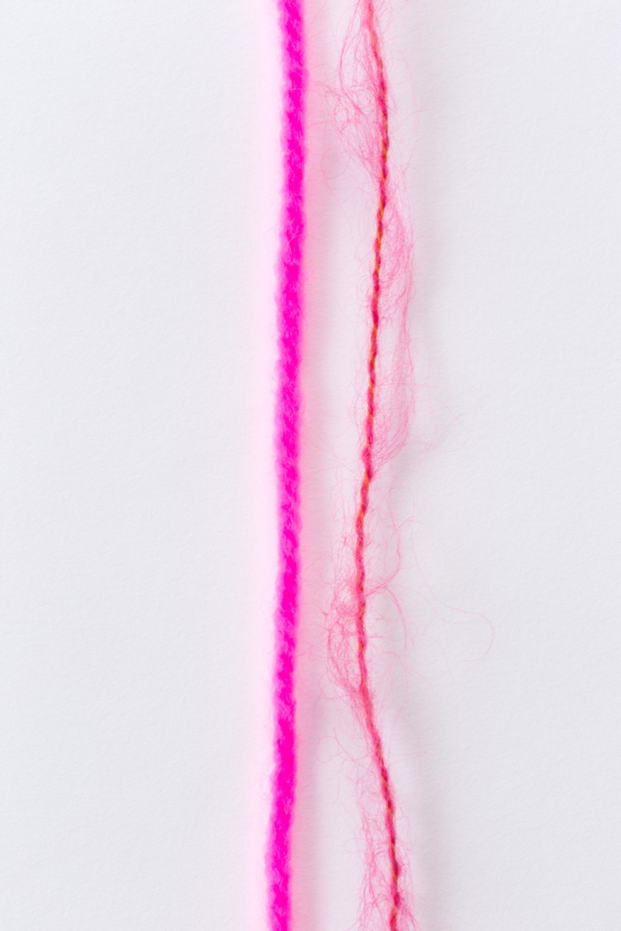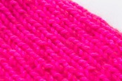 なかなか見かけない鮮やかな蛍光ピンク(ショッキングピンク)のチクチク感のないアクリル素材の毛糸とモヘアの2種を使用しました。